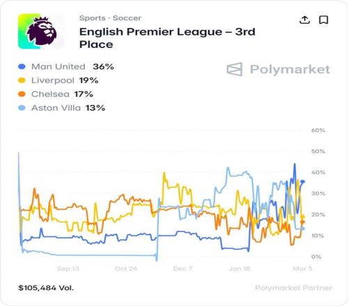根据「PolymarketSport」的分析研究,曼联仍然是本赛季拿到英超第三名的最大热门,有36%的可能性保持目前的排名,第二热门利物浦的几率只有19%,目前与红魔同分的维拉则才13%。但曼联超越前方对手曼城的可能性也很低,瓜迪奥拉的球队跌至第三的机会仅有9%。